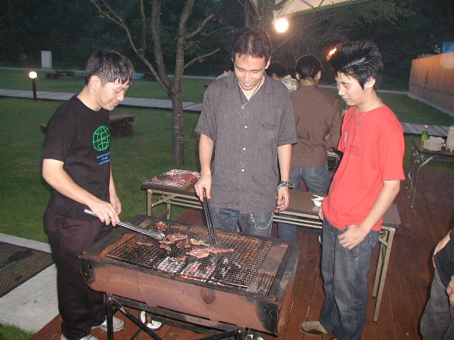 夕食はバーベキュー。夕食後、キャンプファイヤーを囲みながら、飲み会。