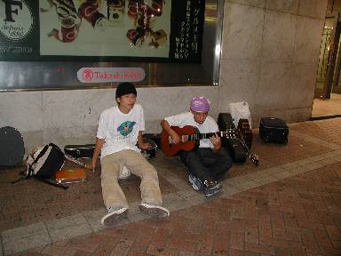 | それは夏合宿最終日のことだった。 8月27日、夏合宿最終日午後9時半。西湖での夏合宿を終え、横浜に戻ってきたギタークラブ一行。バスを降りたところで解散。地下鉄で帰る人と別れ、横浜駅へ向かう相鉄組。その途中、西口前の路上で歌うストリートミュージシャンを横目に見ながら、誰かがつぶやいた。 「こういう所で1回やってみたいな・・・」 密かに同じことを考えていた僕は即座に賛成。すぐに、路上でのコンサート開催が決定となった。しかし、腹がへってはなんとやら、ということで、とりあえず、吉野屋へ。腹ごしらえを済ませた後、いよいよ西口へと向かった。 メンバーは、ふぢわら、たいき、じゅんぺい、僕の4人。フォークギターを持った2人組から10メートル程のなるべく静かな所に陣取る。合宿の荷物を傍らに、座り込んでケースからギターを取り出す。そんなこちらの様子を、前のカップルと、隣のギターデュオが見ているのがわかる。うん、いい感じだ。路上でのコンサート開演。 たいき「よっしゃ、行くぜ!ワン、ツー、スリー、フォー!」 こんなかけ声で始まった1曲目は、ふぢわら、ゆーき、たいきによる、サンバースト三重奏。しかし、こちらの楽器は所詮クラシックギター。隣の二人の音がかろうじて聞こえるだけの音量しか出ない。精一杯右手に力を込めて弾き、弦がビビりまくる。それでも、演奏自体はなかなかの出来。3人の息もぴったり。絶対に合うはずがない、と思われた中間部分もうまく合った。これはすごい! しかし、ここで問題発生。今まで、休んでいた隣のギターデュオが、突然歌い出したのだ。ただでさえ聞こえづらいのに、ますます音が聞こえなくなる。くそー、あいつら絶対わざとだ(怒)。 しかし、そんな陰湿なイジメ(?)にも負けず、サンバースト完奏。しかし、当然ながら、誰も聴いてない。そりゃそうか。 |