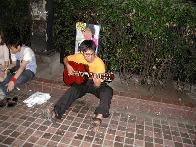 | その後は、個人がバラバラに好きな曲を弾く。これでは、普段の練習と変わらない。そのまま、ダラダラと20分ほど路上で練習(?)する。そして、最後にもう一度サンバーストを3人でやって、路上コンサート終了。観客も拍手もなかったけれど、満足感に浸ることができた。そして、ギター部4人は意気揚揚と、帰路に着くのであった。 コンサートを終えての感想。こういう所でやるのは、音が全然聞こえないが、けっこう楽しいものであることが判明。ぜひともまたやりたいねー。ただ、もう少し静かなところを探したいものだ。 今回の一言。曲を覚えていなかったため、三重奏に参加できなかったじゅんぺい、引き上げる直前にぼそっと一言。 じゅんぺい「あ〜あ、俺もサンバーストやっとけばよかった」 |