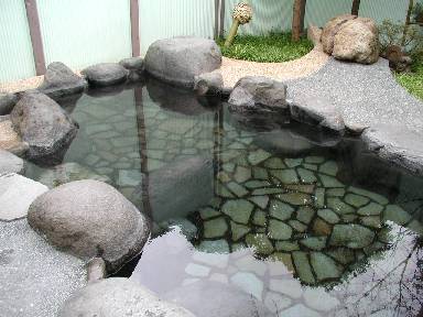 | ここは下田。お風呂はもちろん温泉である。下の写真のような露天風呂もある。室内のお風呂もなかなか広くて、一度に大人数入れそうである。24時間入れるので、温泉好きにはたまらない。泡がブクブクするやつまである。すげー。 |